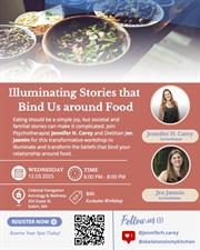 Eating tasty food is one of the most delightful things we get to experience in this life. It nourishes our bodies, and enlivens our senses. Yet, what should be an uncomplicated simple pleasure can become heavily entrapped in stories, beliefs, and messages from familial and societal experiences. In this workshop, registered dietitian Jennifer Jasmin and psychotherapist Jennifer Carey team up to help bring these messages to light so they don’t negatively impact our relationship to the joy and sustenance food can provide for us. Through education, shared experience, dialogue, journaling, and art - we begin illuminating and transforming the stories that bind us around food.